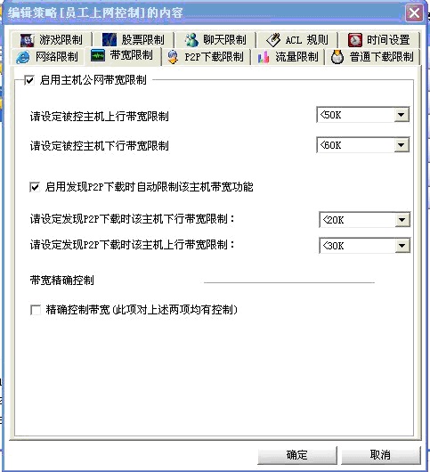 如果是单纯限制局域网速率、监控电脑上网速度对于网络管理而言似乎还不够。这是因为,局域网有些电脑可能需要较高的上网速度、上网带宽,因此不能像对其他电脑一样设置较低的上网带宽;但是,如果对其设置带宽较高,则一旦其采用P2P软件进行下载,例如使用迅雷下载、进行BT下载,则也会占用局域网较大的上网带宽。因此,我们还需要控制内网P2P下载、禁止内网BT下载,防止局域网电脑BT下载对网络资源的过度消耗。聚生上网限制软件提供了有效监控P2P下载的功能,同时还可以屏蔽网络电视、过滤网站视频等功能。我们打开聚生网络过滤软件的“策略配置”的“P2P下载”这里,勾选禁用P2P下载、禁用网络电视、禁止访问视频网站等然后点击确定保存。如下图所示: