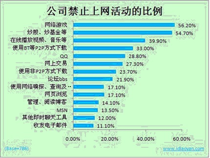 随着国内企事业单位信息化、电子政务工程的深入开展,网络化、无纸化办公已经成为白领工作中不可缺少的、便捷高效的工作方式。在享受着电脑和互联网办公带来的速度和效率的同时,员工在工作期间沉迷网络、不认真工作的现象越来越突出。于是,很多企业都出台了明确的网络使用规章,限制员工的上网活动。近日,爱调研展开了一次名为“互联网使用篇——上班这点事系列调查”的网络调研活动。调查结果发现:被公司禁止的上网行为中,网络游戏的被禁止比例是较高的,达到了56.2%;其次为炒股、炒基金等上网活动,占到了54.7%;另外有39.9%的公司禁止员工在线播放视频、音乐;33.0%的公司禁止员工使用P2P的方式下载网络资源。被禁止得比较少的网络行为包括收发电子邮件(11.1%)、MSN(13.5%)、管理阅读博客(14.1%)等。