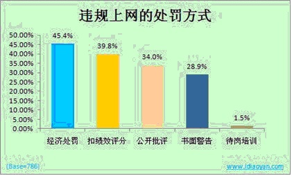 另外调查也发现,员工的违规上网行为一经发现,会受到严格的处罚。45.4%的公司会对员工进行经济上的处罚;39.8%的公司将上网行为和绩效评分联系起来,如果违规上网则会扣其相应的绩效分数;34.0%的公司会对违规上网的员工进行公开批评;28.9%的公司会对违规上网员工进行书面警告;另外还有1.5%的公司会采取较为极端的待岗培训等处罚方式。