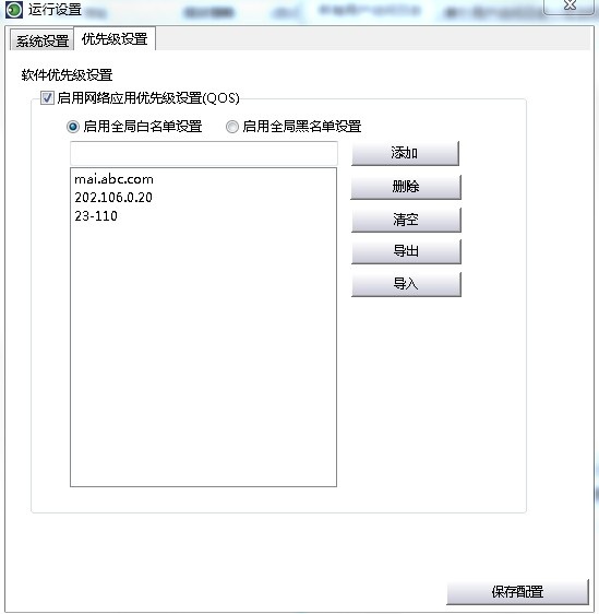 其次,对于局域网需要监控的电脑的一些上网行为,尤其是与工作相关的网络应用,如收发邮件、视频会议、ERP系统、OA系统等一些重要的业务系统的网络传输,聚生网管工具软件集成了“应用程序优先级机制(QOS)”,这种机制的原理是将单位重要的网络应用所访问的公网IP地址、网址、端口等信息,添加到一种类似于免监控的白名单中,一旦聚生网管系统在收到局域网电脑向这些IP地址、端口和网址发送请求时,由于已经得知这些网络应用是与工作相关的网络传输,则聚生网管系统就直接将其转发,而不进行深度的过滤或拦截,从而可以保证这些网络应用获得较高的传输速率,从而保证员工正常的、与工作无关的网络应用可以获得较佳性能,从而实现了带宽优先级和应用程序优先级的网络管理机制。如下图所示: