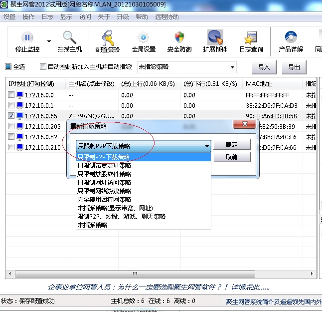 然后,我们需要给电脑指派上网控制策略。由于对带宽占用较大的就是那些P2P软件,所以我就用聚生网管自带的只限制P2P下载的策略来指派给局域网所有电脑,从而可以禁止其P2P下载,如下图所示: