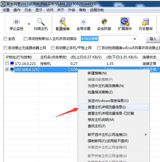 聚生网管系统(www.grabsun.com)集成的“查看主机详细流量”功能,可以深入分析网络流量的具体内容,如报文数量、报文大小、报文协议、DNS解析等,从而为网络管理提供更为详实的借鉴和参考,帮助网管员真正实现局域网带宽分配和局域网流量分配提供了根据。如下图所示: