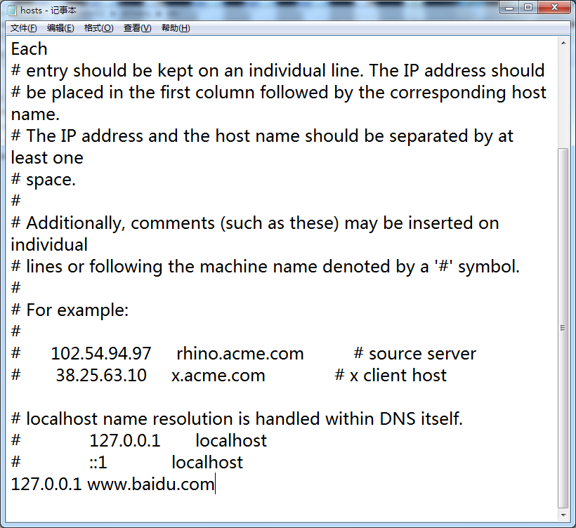 首先打开以下路径:c:\windows\system32\drivers\etc,以记事本方式打开hosts文件,然后添加想要禁止访问的网址比如“百度”如下图所示,保存之后本机将不能再访问百度。网络管理员可以随意添加想要禁止的网址来达到管控目的。只是这种方法有两点不足:一是操作繁琐,需要手动添加,如果网址和电脑数量多则要耗费很长时间了。二是使用者只要略懂一些这方面知识就可以轻易修改回来,使控制失效。这种方法可能更适用于电脑数量不多的局域网或家庭使用。