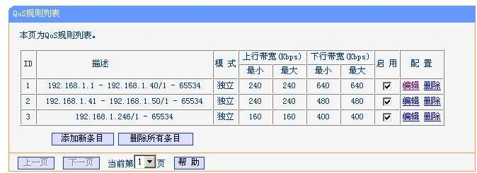 首先开启QOS设置开关,上行和下行总宽带分别将路由器配置为100000Kbps,然后对QOS规则进行设置:“添加新条目”,输入IP段和端口,模式较好选择独立的宽带。