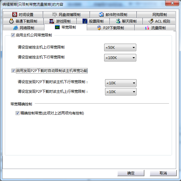首先下载聚生网管(http://www.dashizhi.com/download/grabsun.rar)安装并运行,点击启动控制,软件自动扫描局域网内所有主机列表,限制电脑的网速需要为相应的电脑指派上网策略,右键为选中主机指派策略即可,然后双击此策略弹出编辑策略对话框,点击带宽限制,选中“启用主机网络公网带宽限制”并设置合适的上下行带宽限制,确定即可。