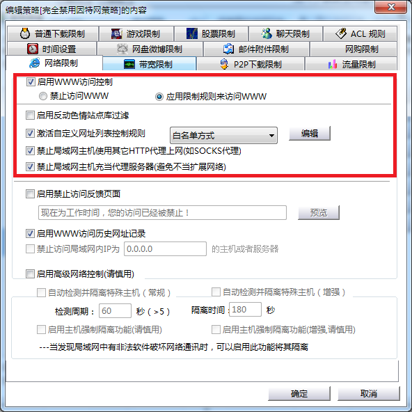 目前几乎所有网络管理软件都集成网址过滤功能,比如较常见的“聚生网管”系统(下载地址:http://www.grabsun.com/soft.html)只需要在一台电脑安装即可控制局域网其他电脑的上网行为,为企业在时间和人力上节省了不少不必要的支出。通过启用WWW访问控制,以添加网址到白名单或者黑名单的方式,就可以使员工只能登陆特定的网站,精确有效的实现了上网控制,如下图所示: