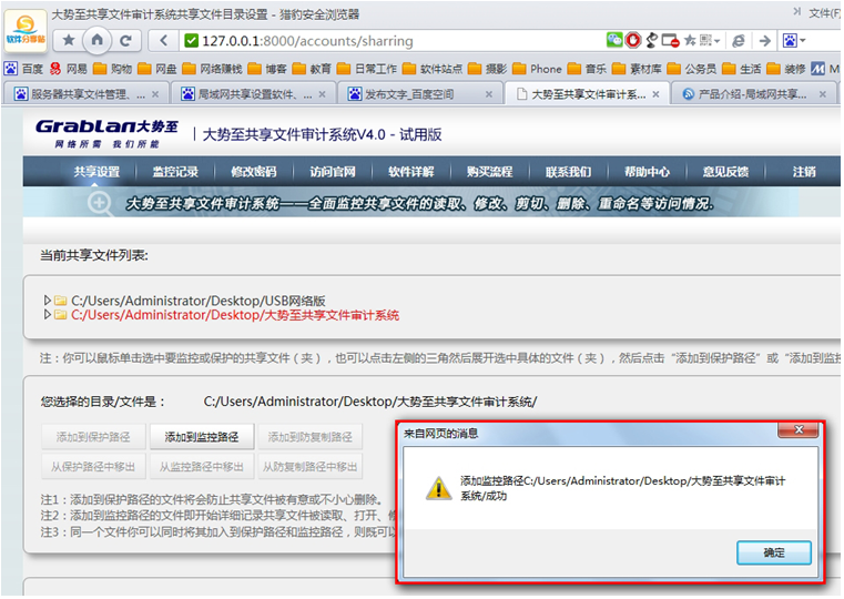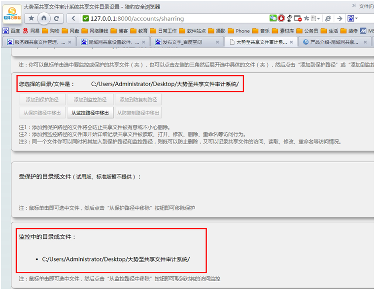 下面也会提示您选择的目录/文件是:C:\Users\Administrator\Desktop\大势至共享文件审计系统