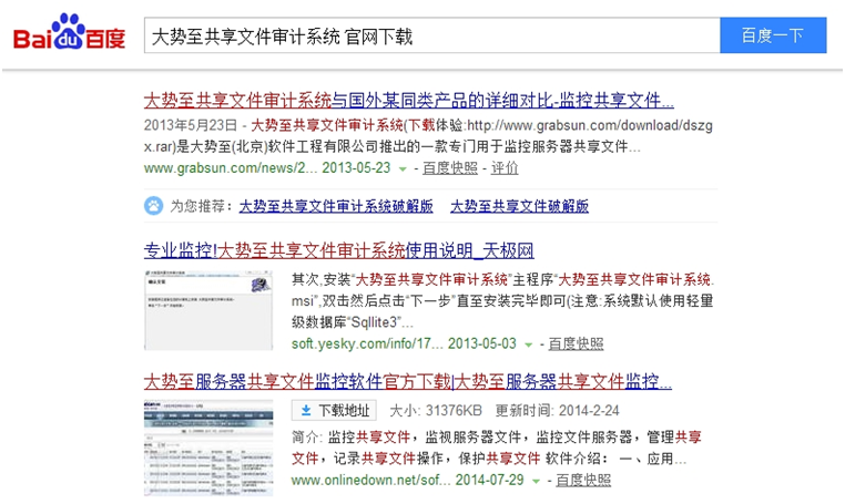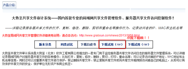 1.首先,找到下载地址,可在百度搜索“大势至共享文件审计系统 官网下载(下载地址:http://www.grabsun.com/gongxiangwenjianshenji.html)”如下: