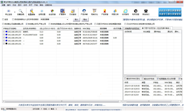 注:上图中就是整个聚生网管的界面,可以说界面简单明了很清爽的感觉,操作一看就很简单,即使不会的人也很容易上手,从软件的界面上不难看出一些重要的字段如:网络名称VLAN_1,下面的状态栏列出了这个局域网中主机的总数是5,在线:4,离线:1、监控的状态以及主机的一些信息等,这里只是简单的说一下,从下面开始都是以实例为主,从实例中体验一下聚生网管这款上网行为管理软件。