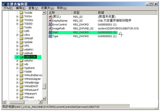 (2000系统下)或HKEY_LOCAL_MACHINE\SYSTEM\CurrentControlSet\Services\usbstor(XP or 2K3),在对应的usbhub(或USBSTOR)分支右边子窗口中,双击一下“Start”键值,在弹出的数值设置窗口中,检查一下其中的数字是多少,如果是4,表明该计算机的USB端口使用权限已经被限制起来了;如果是3,表明该计算机的USB端口使用权限已经被启用起来了,这里确保是4。