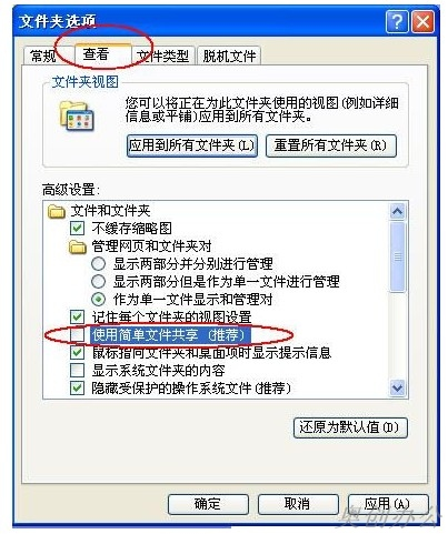 3、有时候需要禁用XP系统里面的简单文件共享,工具-文件夹选项-取消勾选即可。如下图所示: