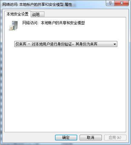 原因:禁用来宾帐户,并且“网络访问:本地帐户的共享和安全模式”安全选项被设置为“仅