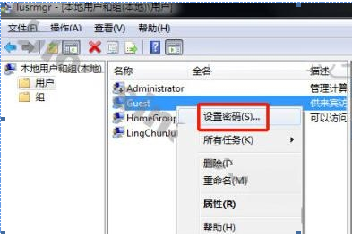 2)然后在打开的管理界面中依次展开“本地用户和组-用户”,在右边窗口中右击账户“Guest”选择设置密码,如下图所示: