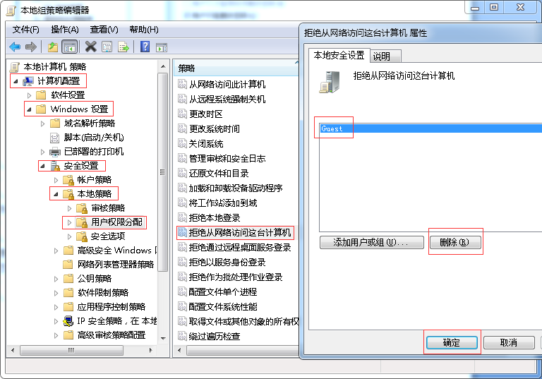 3、依次展开:计算机配置-Windows设置-安全设置-本地策略-用户权限分配-在拒绝从网络访问这台计算机设置中删除guest账户(如果有的话),并点击“确定”。如下图所示: