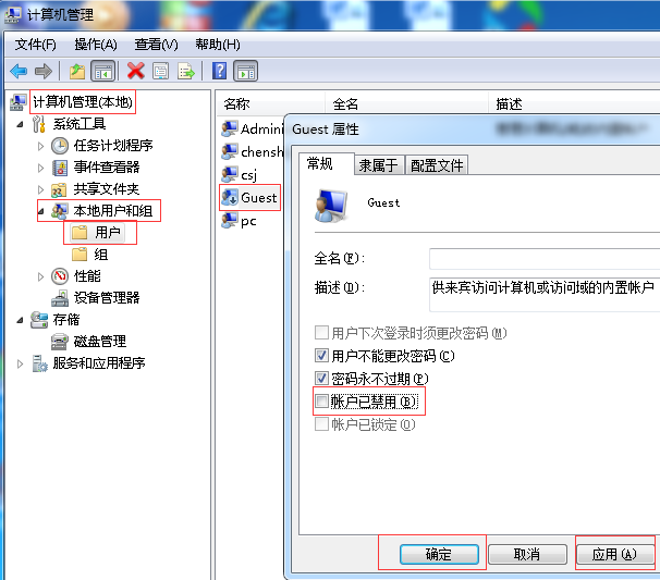 1、启用本地guest帐户,默认它是禁用的。(如果不启用guest帐户,而使用第4步,将会出现访问时出现对话框,要求输入用户名和密码,并且Guest用户名呈灰色不可选状态,只能输入密码)。方法:右键点击计算机-管理-本地用户和组-用户-右键点击“guest”,然后取消勾选“账户已停用”这里的对勾,并点击“应用”、“确定”即可。如下图所示: