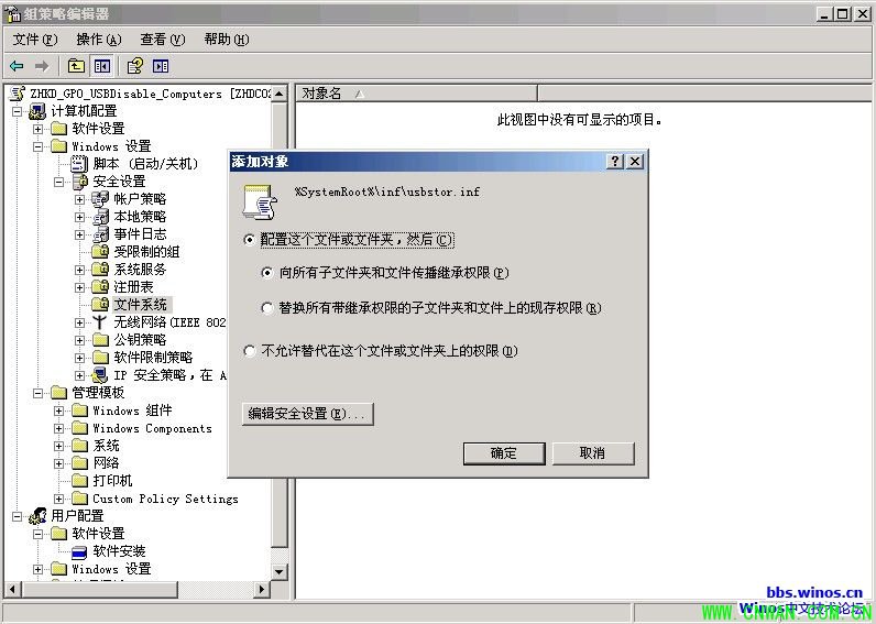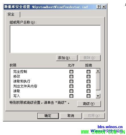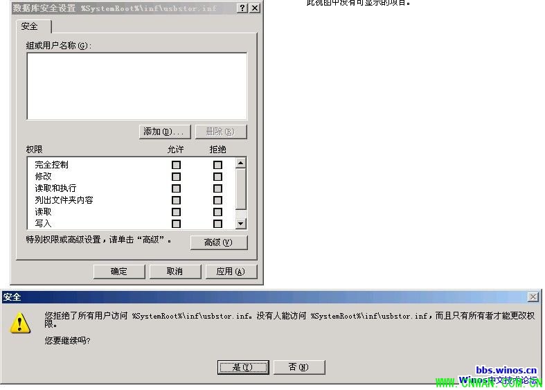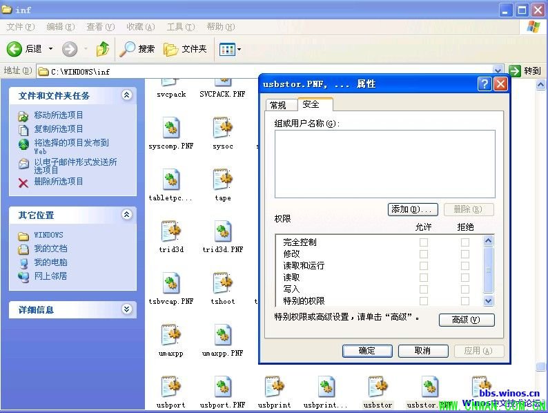 8、查看客户端计算机c:\windows\inf\usbstor.inf及usbstor.pnf的NTFS权限,发现里面所有安全组已被删除。策略应用成功,普通用户无法再使用USB存储设备。