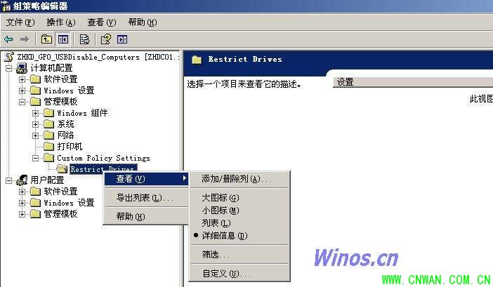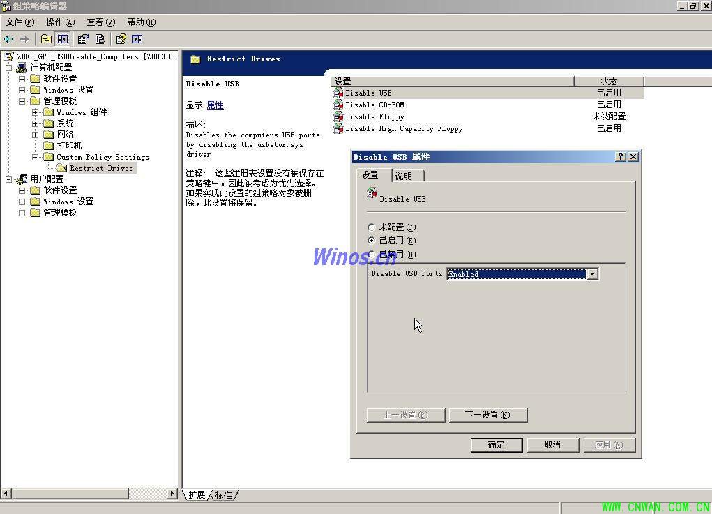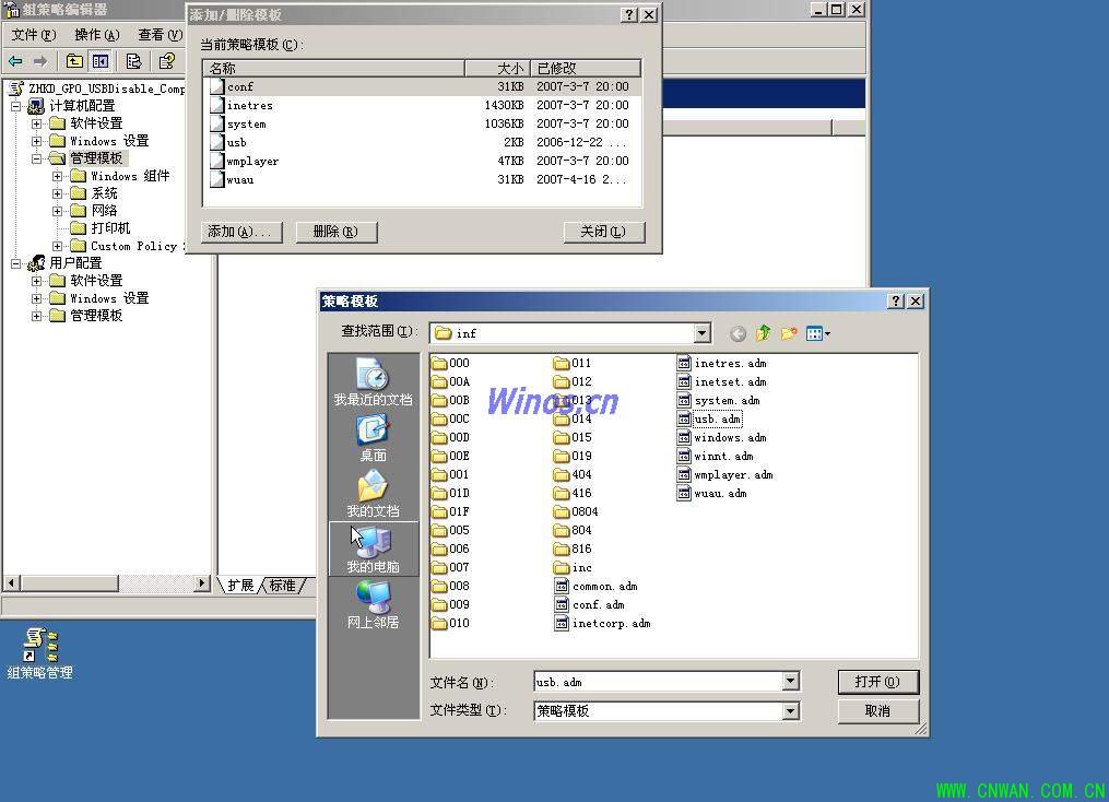 4、右键管理模板--点添加删除模板--添加usb.adm的模板文件--点关闭窗口中出现custom policy settings进入,就可以看到那个设备的,右键你想设置的设备如disable usb 出现属性对话框点已启用在disable usb ports 中选enabled确定后重启计算机,就会发现usb接口不能用了,要恢复就禁用或选disabled,其它设备也是同样的操作