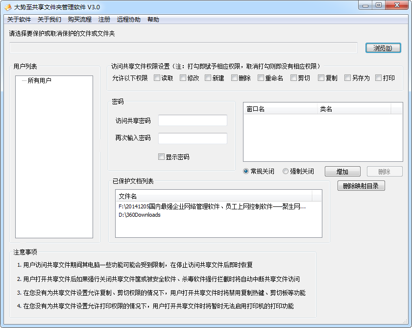 此外,通过“大势至共享文件夹管理软件”还可以设置共享文件访问密码,防止外来人员或没有共享文件访问权限的人员访问共享文件的行为。同时,还可以增加访问共享文件的用户,并且为不同用户设置访问共享文件不同权限等功能,全面保护服务器共享文件的安全。