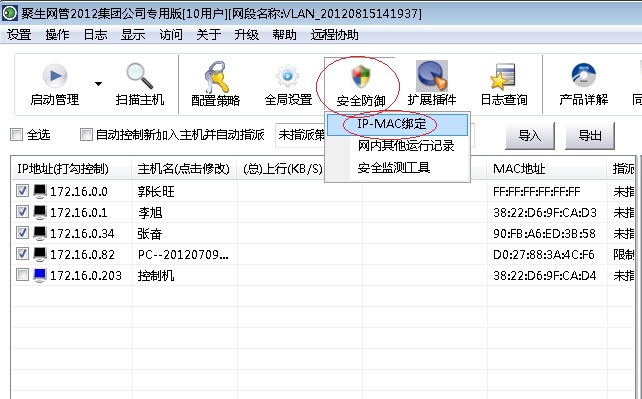 目前国内有很多局域网控制软件、网管监控软件,一般都有IP和MAC地址绑定的功能。通常,通过此类网管软件可以轻松扫描到局域网电脑IP地址和MAC地址,然后点点鼠标就可以实现绑定。例如,有一款“聚生网管”软件(下载地址: