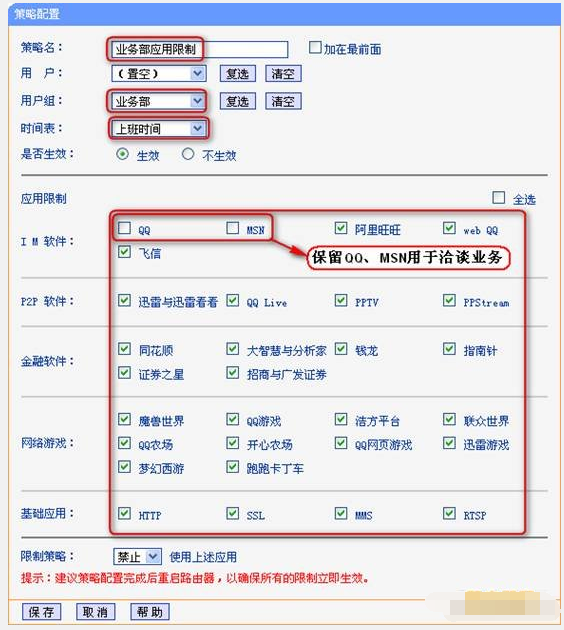 应用限制----策略管理,进入策略管理界面,点击“添加策略”按钮,输入策略名,此处为“业务部应用限制”,在用户组下拉菜单框中选中“业务部”,时间表中选择”上班时间”,勾选需要禁止使用的软件,限制策略选择“禁止”,保存即可。