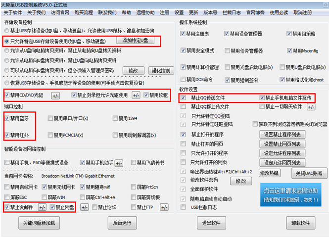 1、指定某些U盘拷贝电脑中的文件,除此之外任何usb存储设备都无法连接电脑拷贝资料,包括手机或者SD卡等;