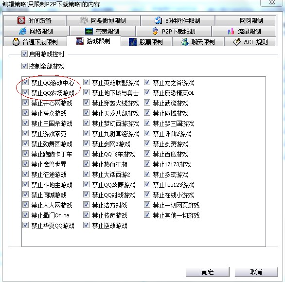 此外,聚生网管系统还可以屏蔽QQ游戏、禁止征途游戏所有主流的网络游戏,实现了禁止干部上班玩游戏、禁止公务员玩游戏的行为。如下图所示: