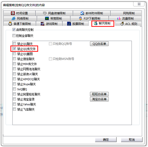 通过上面的设置,我们较终实现的只是控制QQ传文件这个功能,QQ其他功能完全不受影响,而且我们还可以通过白名单来设置允许使用的QQ账号。通过截图我们可以看到,不但可以管理QQ,还可以禁止微信聊天、禁止MSN传文件、禁止ICQ聊天、禁止网易泡泡等几乎全部的聊天软件,还可以定制封堵某些聊天软件。