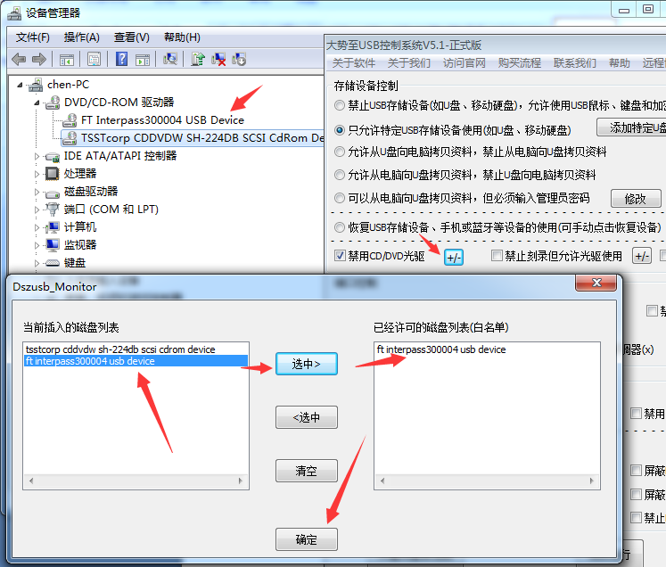 但是由于当前很多网银的U盾有自动安装驱动的功能,会在我的电脑里面出现一个虚拟的光驱,如果这个时候你同时勾选了“禁用CD/DVD”设备之后,同样也会导致网银U盾无法使用,这个时候我们只需要将网银U盾的光驱加入到许可的光驱列表即可。如下图所示:
