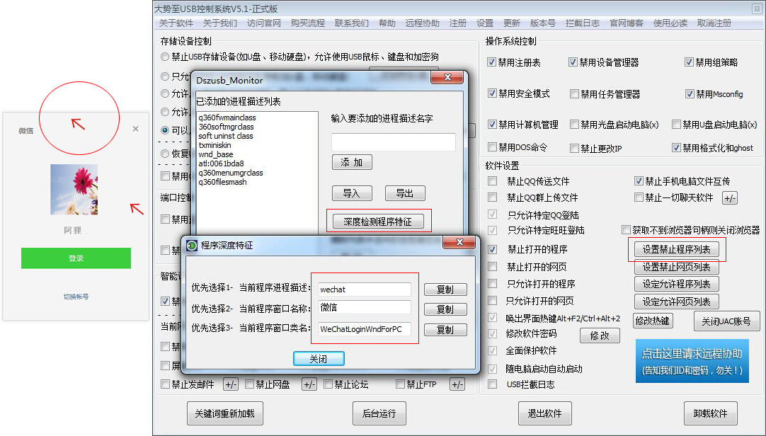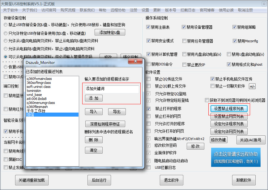 大势至USB管理软件在控制程序运行或者安装方面,较大的特点就是简单!一切只需要输入关键词,如果不知道关键词,还有关键词检测工具,设计的实在太周全、太人性化了。