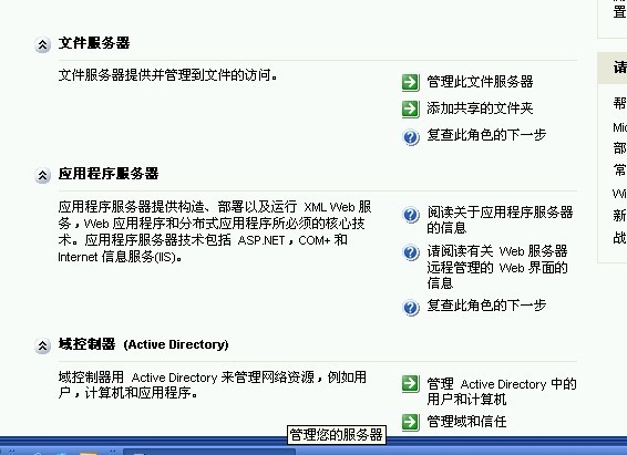 出现上图所示的提示,这是为什么呢?呵呵,这是因为我们在服务器上设置的共享文件,没有映射到域中。我们再次切换到服务器上,打开“管理您的服务器”