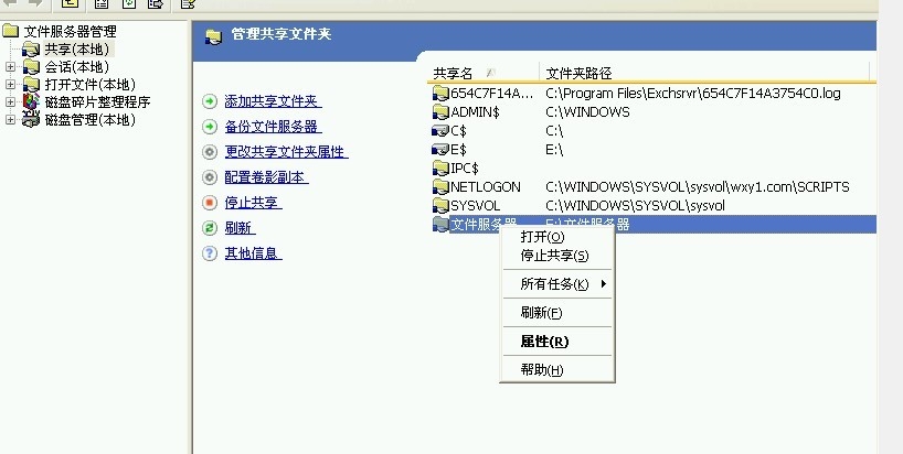 管理此文件服务器,找到共享的文件夹,选择“属性”