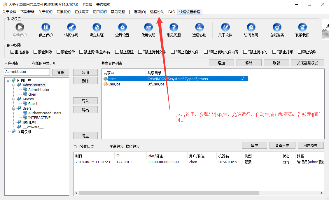 在大势至共享文件管理系统界面上点击“远程协助”,然后会弹出远程协助软件,稍等便可自动生成ID和密码,然后告知我们,便可以为您提供人工远程服务。注:远程协助期间,不要关闭本软件,否则会导致远程协助实时中断。如下图: