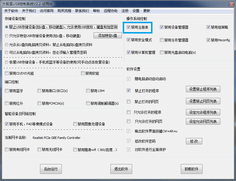 可以看出,大势至USB控制系统不仅可以禁用注册表,还可以禁用设备管理器,禁用组策略,禁用安全模式,禁用任务管理器等等,全面防止修改电脑系统配置保护系统安全。
