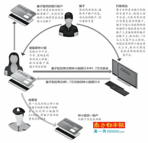 钟小姐被骗,上了假冒的电商网站,并填写了姓名、银行卡号、密码等信息。随后,其账户被转走1.7万元。随后钟小姐联系对方,骗子称其操作不当,导致账户冻结,可在A TM机按其提示操作,以取回“被冻结”款项。