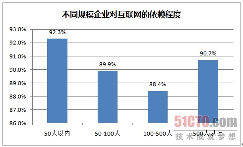 现代经济对互联网的依存度达到前所未有的高度,各个行业不论规模大小,均有超过90%的企业完全或高度依靠互联网开展业务,科技/互联网、金融、电信是对互联网依存度较高的行业,而其中创业型小微企业(50人以内)更甚,互联网成为这类企业发展的重要根基。
