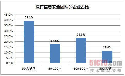 小微企业尤其是小微金融企业成为信息安全的较大风险点,接近40%的小微企业(100人以下)无信息安全团队和资金投入,而超过50%的金融企业没有任何安全方面的投入。与之相对的,互联网与电信行业在信息安全建设方面则已有较好基础,这些企业超过76%已有信息安全方面的专项投入。