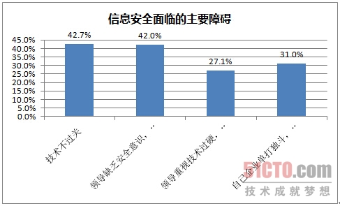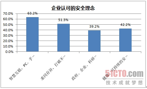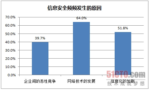 64%的企业认为信息安全频频发生是由于“网络技术的进一步发展”,52%的企业认为是信息化加剧了信息安全隐患。