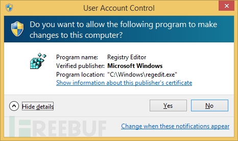 上述这些改变在 Windows 7中有效,在Windows 8/8.1中 EnableLUA 不会被更改为禁用状态。因此,在将“用户帐户控制”设置为“从不通知”时,只产生了下列改变: