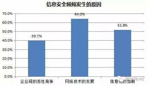 64%的企业认为信息安全频频发生是由于网络技术的进一步发展,52%的企业认为是信息化加剧了信息安全隐患。