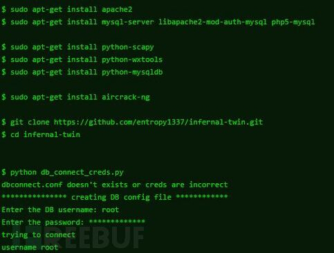 $ sudo apt-get install apache2 $ sudo apt-get install mysql-server libapache2-mod-auth-mysql php5-mysql $ sudo apt-get install python-scapy $ sudo apt-get install python-wxtools $ sudo apt-get install python-mysqldb $ sudo apt-get install aircrack-ng $ git clone https://github.com/entropy1337/infernal-twin.git $ cd infernal-twin