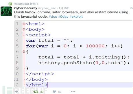 //使用下面这段JavaScript代码能让firefox,chrome,safari浏览器崩溃,而且还能让iphone重启。