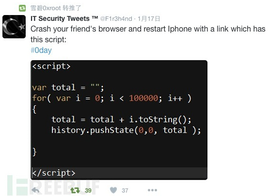 //把带有下面这个脚本的链接发给你的朋友,能让你朋友的浏览器崩溃,而且让Iphone重启。