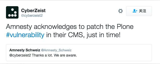 此后,CyberZeist 又发布了一条消息,表示国际特赦组织的网站也收到此漏洞的影响,该消息得到了对方的证实。